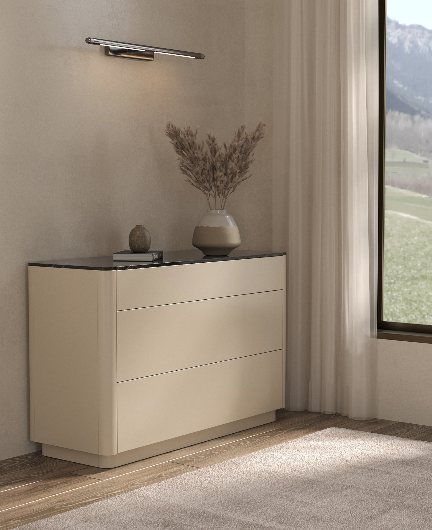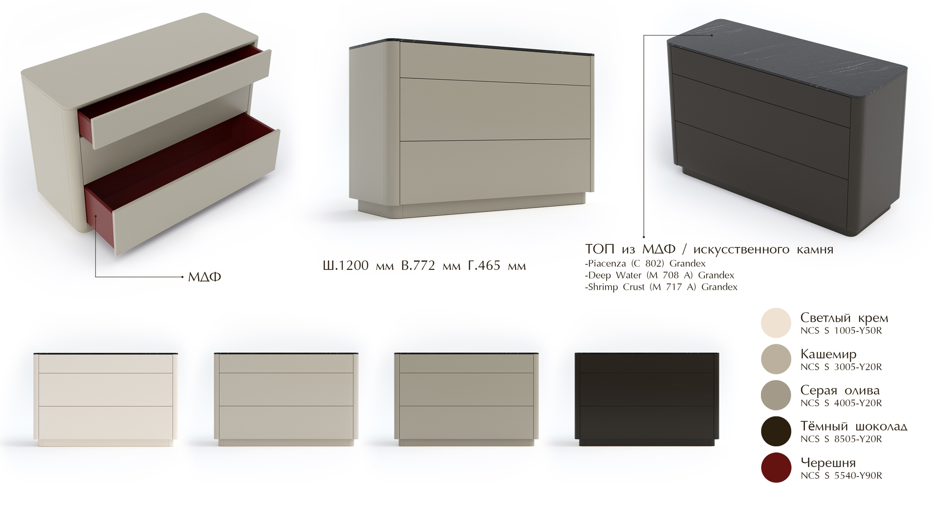 Fancy - это современная и стильная коллекция малых форм для спальни и гостиной! Благодаря скругленным боковинам создается гармония и уют в вашей комнате! На выбор несколько базовых цветов эмали, либо можно подобрать любой другой цвет по RAL или NCS каталогу. 2 варианта топа (эмаль или искусственный камень)